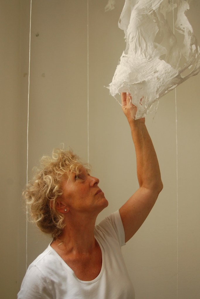 Die fragilen Werke aus „Cotonage“, meiner Technik aus „flüssiger Watte“und Draht, sind zumeist Abformungen von Körper -fragmenten, freien Konstruktionen oder Fundstücken. Durch ihre Materialsprache transportieren sie zugleich „das Feine und das Grobe, das Leichte und das Schwere, das Schöne und den Zerfallsprozess“. Formen und Figuren, die in ihrer Hülle eine Fülle erahnen lassen,- das Dazwischen wird zum Thema.